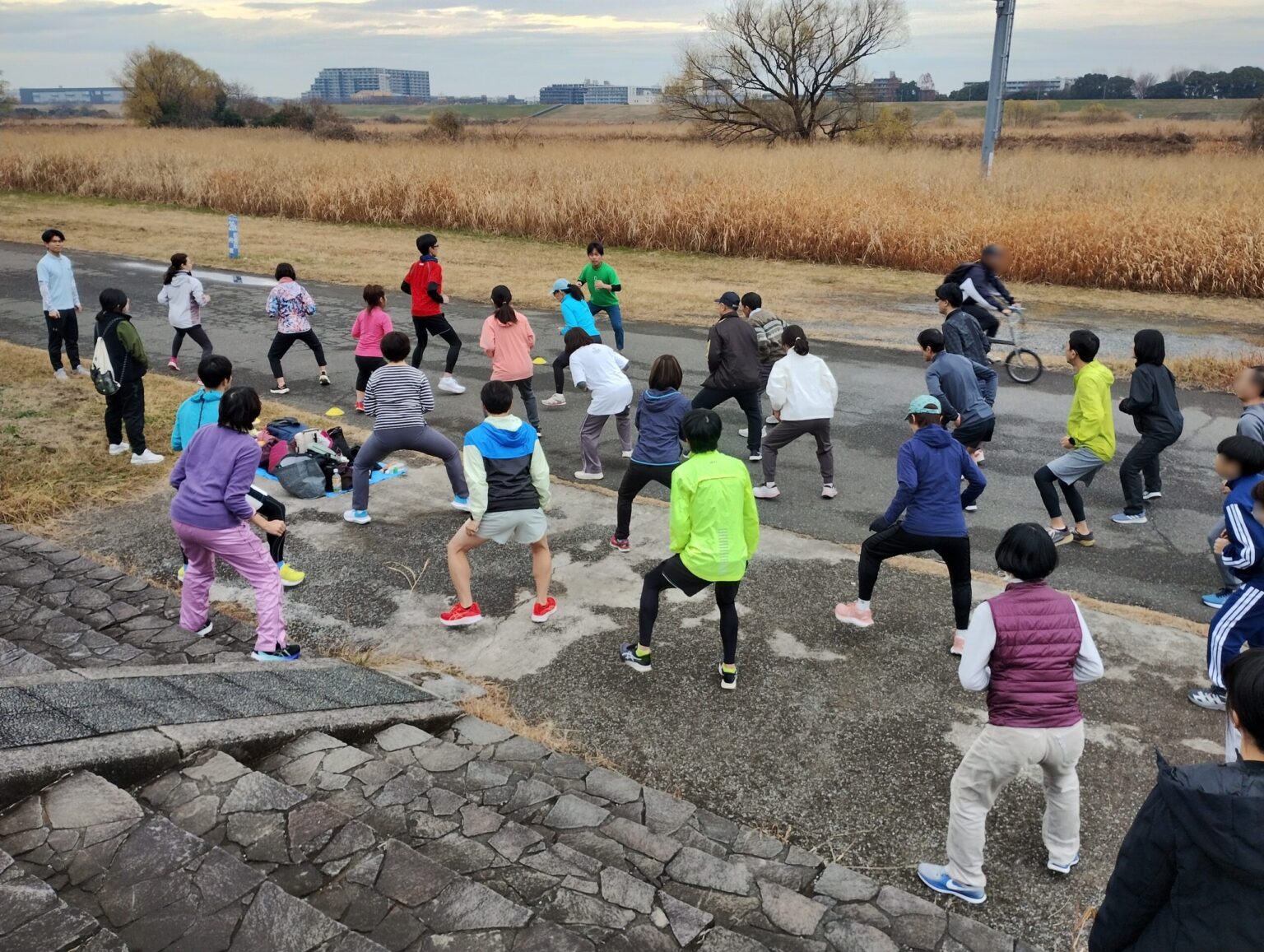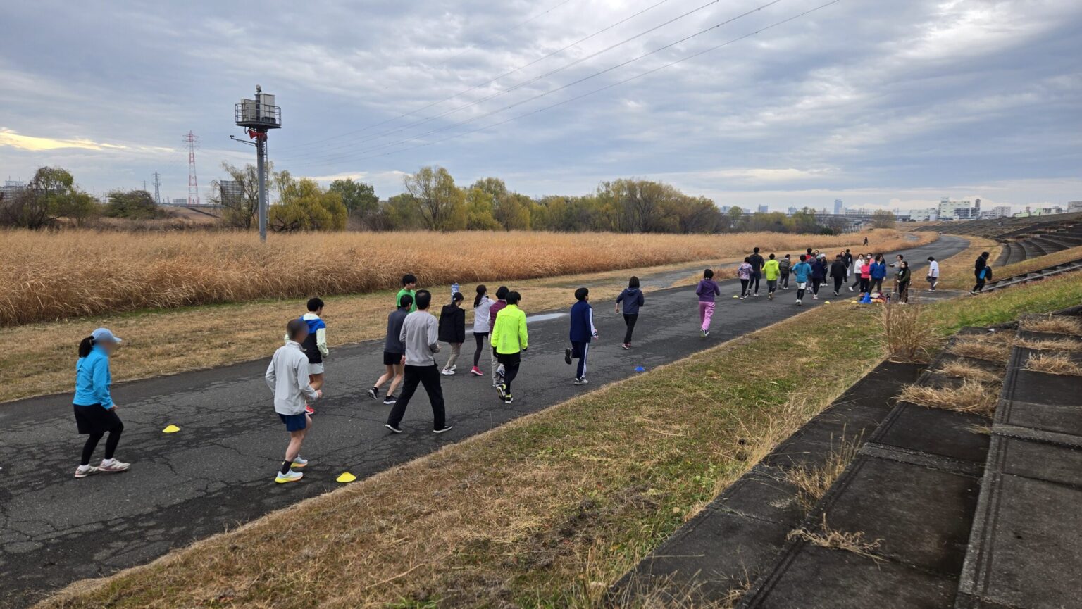股関節の使い方を中心にランニングドリルを実施し、河川敷を1㎞弱走りました。