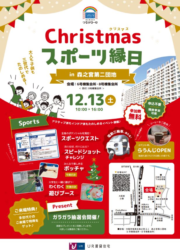 親子で参加できる『スポーツクエスト(簡易版)』を大阪府・UR森之宮第二団地で開催されました「Christmasスポーツ縁日」にて実施いたしました。