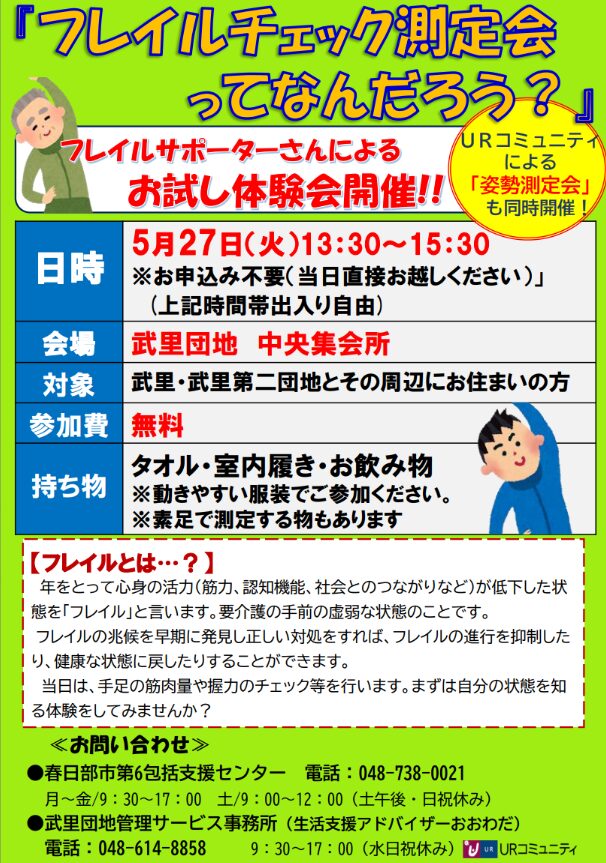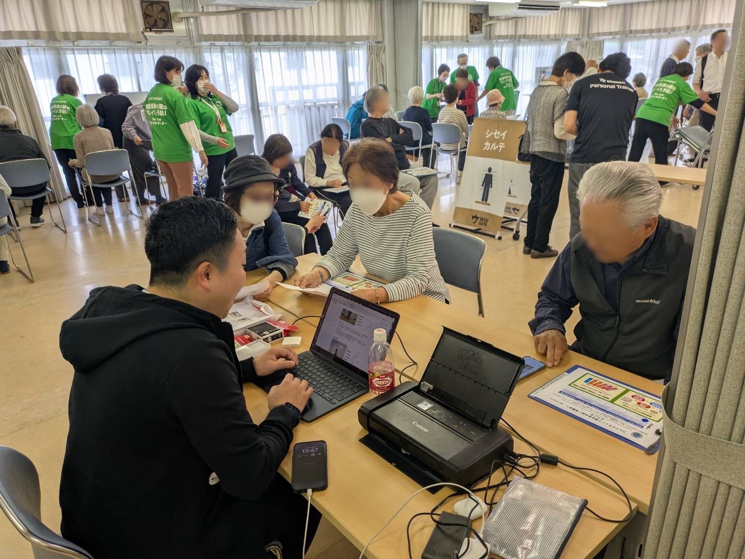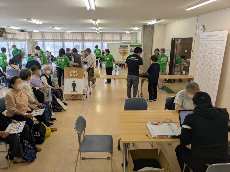 UR武里団地にてフレイル予防のコンテンツとして、パーソナルトレーナーが姿勢診断を実施しました。当日は100名を超える来場者に参加をしていただきました。