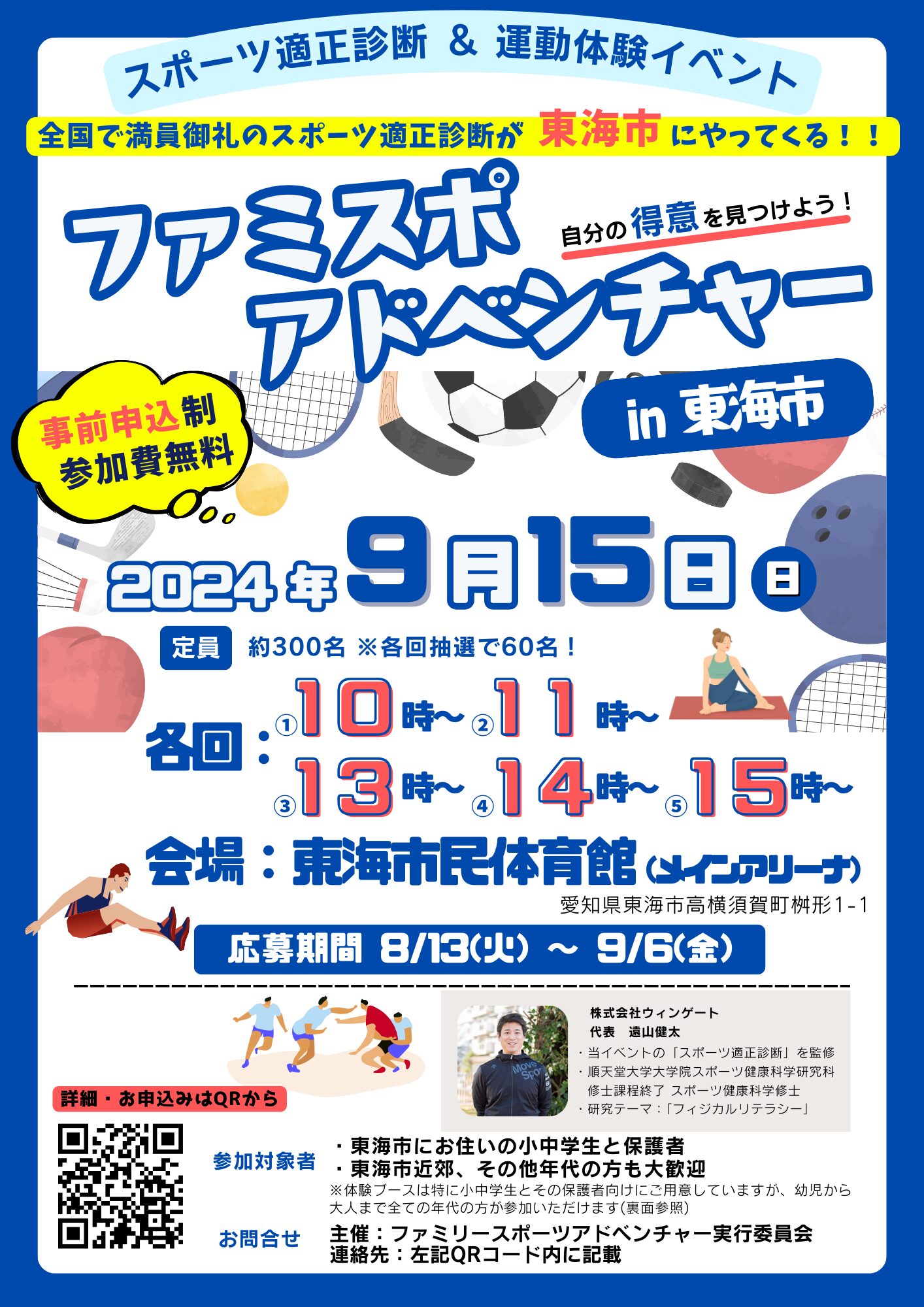 親子で参加できる『スポーツ適性診断』を、東海市民体育館で開催されました「ファミスポアドベンチャー in 東海市」にて実施いたしました。4種目の体力測定から、現在の体格・運動能力で楽しく取り組めるスポーツを提案する『スポーツ適性診断』を、多くのご家族にご参加いただきました。