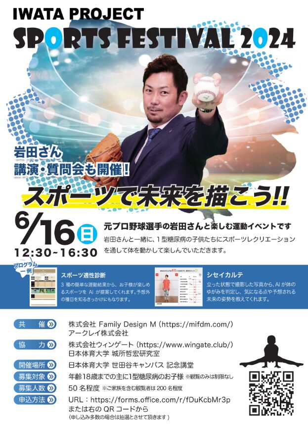 「IWATA PROJECT SPORTS FESTIVAL」とは、1型糖尿病のある子どもたちの応援と糖尿病の啓発活動を目的とした取り組み「IWATA PROJECT」の一環として開催されるスポーツイベントで、募集対象は主に1型糖尿病のある子どもやそのご家族となります。