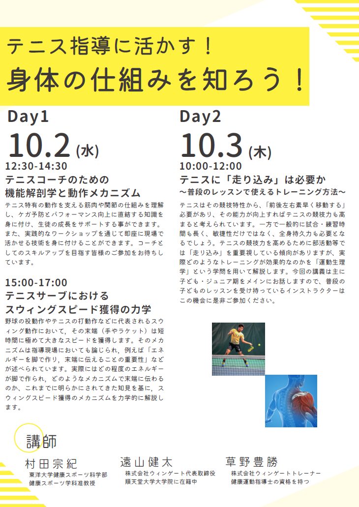ジュエ様よりご依頼を頂きまして、ジュエ社内テニスコーチを対象に研修を実施しました。 ウィンゲートからは、代表取締役・遠山健太と所属トレーナーの草野が担当し、スポーツ科学の観点に基づきお話をいたしました。